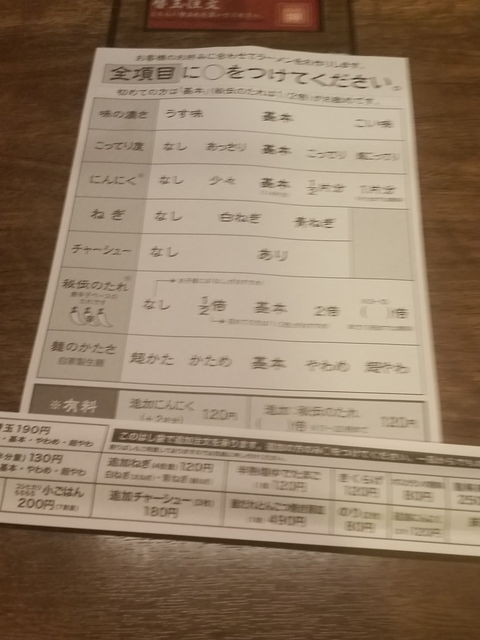 他の店舗と同様に自分の好みに合わせて、ラーメンの味付けなどを決定します。今回は、味の濃さを普通、こってり度を超こってり、にんにくなし、ネギを白ネギ、チャーシューあり、秘伝のタレ1/2、そして、麺を普通にしました。