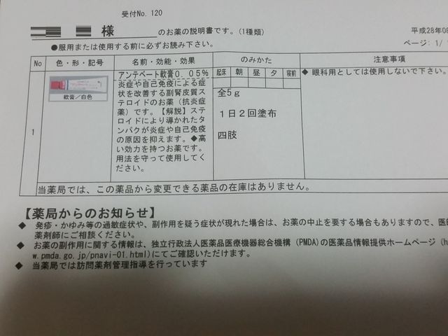 今回、塗り薬でもらったのは「アンテベート軟膏」という塗り薬です。「炎症や自己免疫による症状を改善する副腎皮質ステロイドのお薬(抗炎症薬)です。ステロイドにより導かれた淡泊が炎症や自己免疫の原因を抑えます。高い効力を持つお薬です。用法を守って使用してください。」