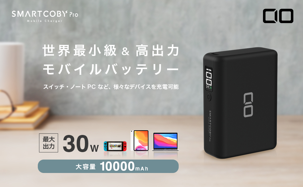 SMARTCOBY Proは10000mAhの超小型ながら、30W高出力に対応した次世代のモバイルバッテリーです。