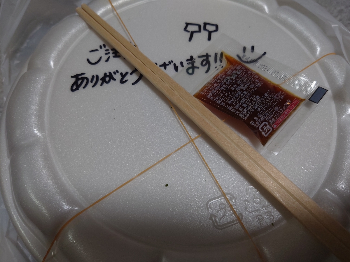 そして、こちらが注文したお好み焼きです。手書きのメッセージがうれしいです。