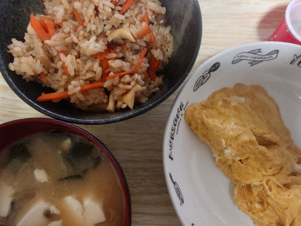 こちらが即席のフライパンで作った炊き込みご飯です。これがなかなか美味しいです。もちろん、炊飯器で作ったほうが失敗が少ないし、野菜にもしっかり火が通るので、炊飯器で作るほうがおすすめですが、あくまで余ったごはんの対策です。